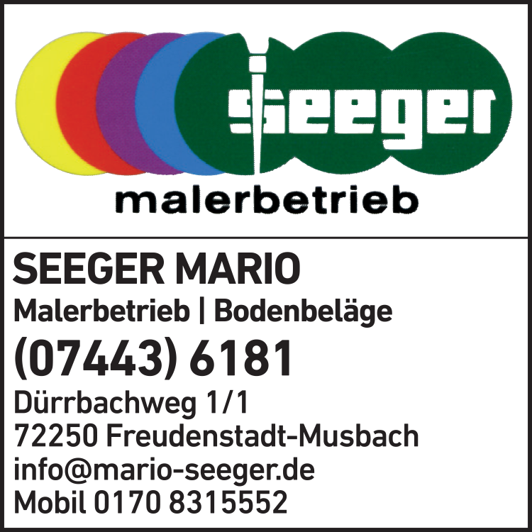 Die Adresse von Seeger Mario Malerbetrieb lautet: Dürrbachweg 1/1, 72250 Freudenstadt