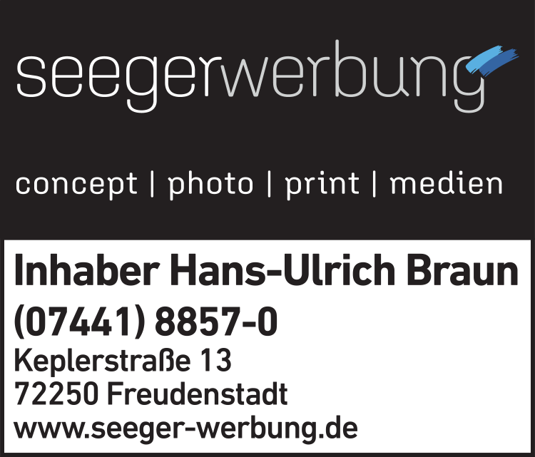 Die Adresse von Seeger Werbung GmbH & Co. KG lautet: Keplerstr. 13, 72250 Freudenstadt