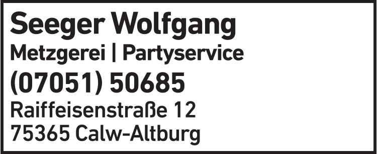 Die Adresse von Seeger Wolfgang Metzgerei lautet: Raiffeisenstr. 12, 75365 Calw