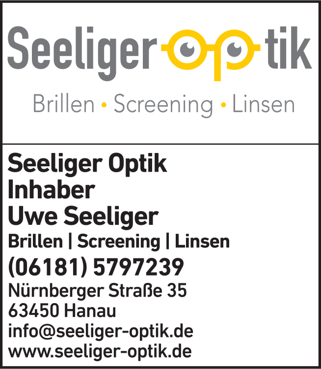 Die Adresse von Seeliger Optik, Inh. Uwe Seeliger lautet: Nürnberger Str. 35, 63450 Hanau