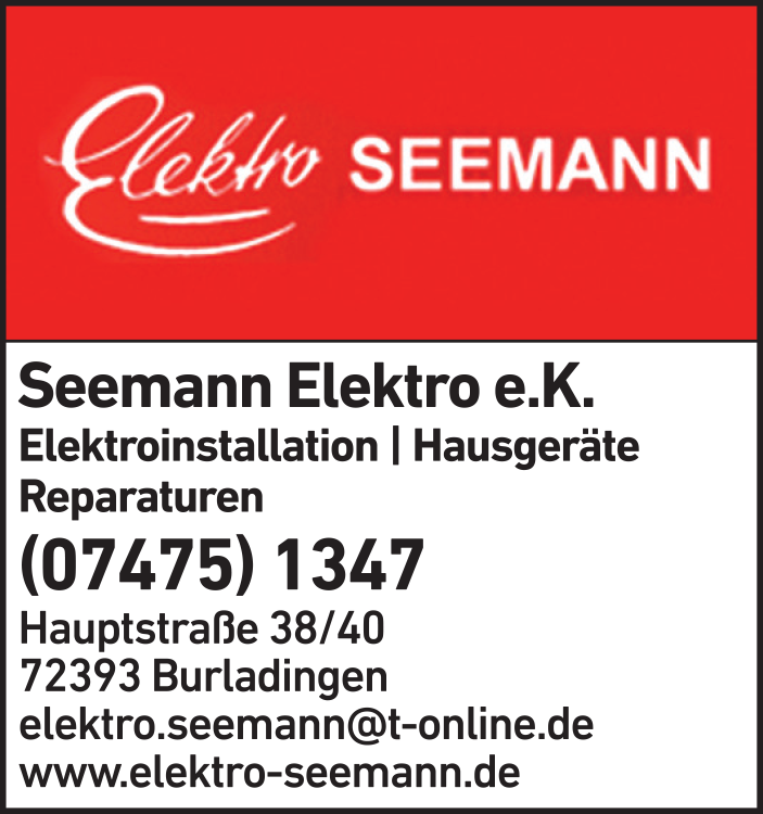 Die Adresse von Seemann Elektro e.K. lautet: Hauptstr. 38/40, 72393 Burladingen