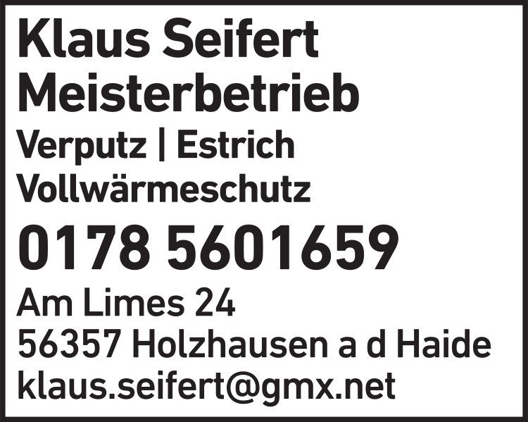 Die Adresse von Seifert Klaus Meisterbetrieb lautet: Am Limes 24, 56357 Holzhausen a d Haide