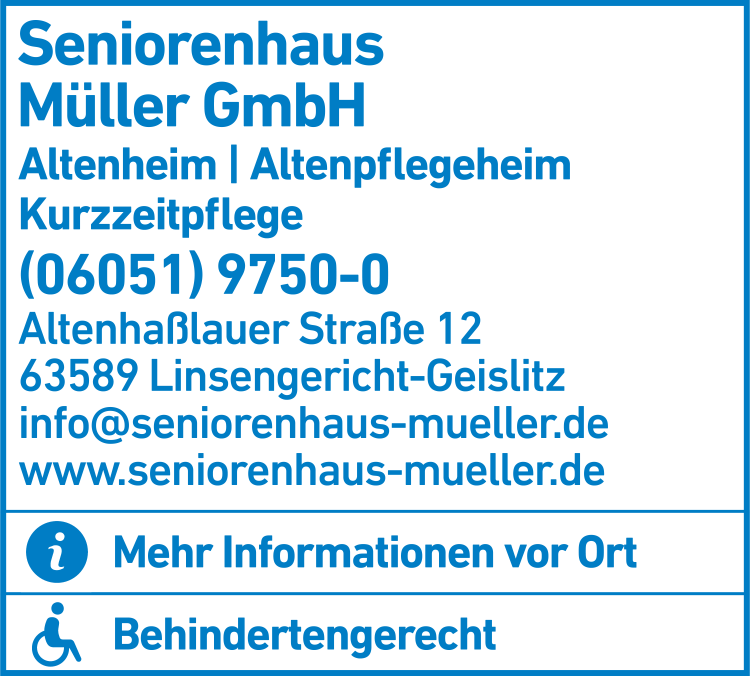 Die Adresse von Seniorenhaus Müller GmbH lautet: Altenhaßlauer Str. 12, 63589 Linsengericht