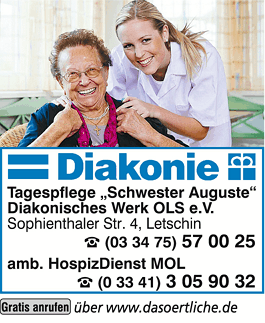Die Adresse von Seniorentagespflegeeinrichtung Diakonie lautet: Sophienthaler Str. 4, 15324 Letschin
