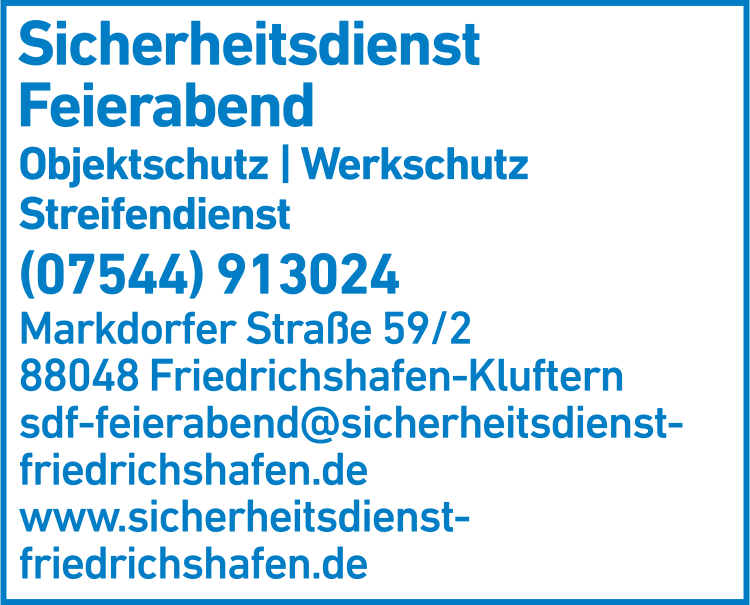 Die Adresse von Sicherheitsdienst Feierabend lautet: Markdorfer Str. 59/2, 88048 Friedrichshafen