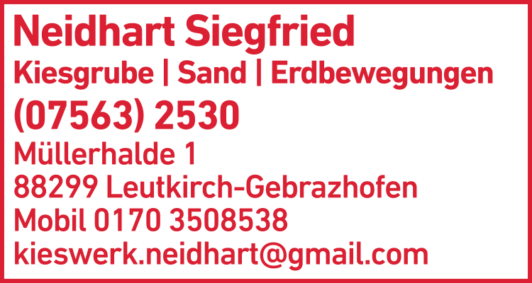 Die Adresse von Siegfried Neidhart Kies-Sand-Erdbewegungen lautet: Müllerhalde 1, 88299 Leutkirch-Gebrazhofen