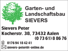 Die Adresse von Sievers Garten- und Landschaftsbau lautet: Kocherstr. 38, 73432 Aalen