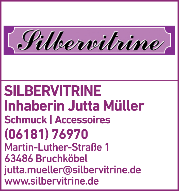 Die Adresse von Silbervitrine Inh. Jutta Müller Schmuck, Silberschmuck, Accessoires lautet: Martin-Luther-Str. 1, 63486 Bruchköbel
