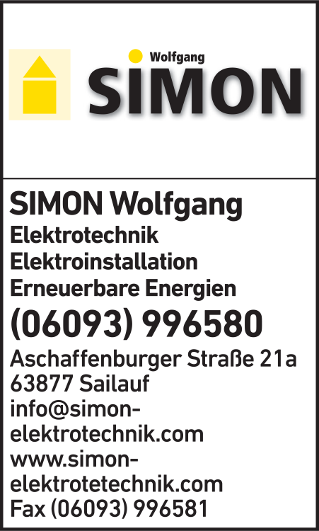 Die Adresse von Simon Wolfgang Elektrotechnik lautet: Aschaffenburger Str. 21 a, 63877 Sailauf