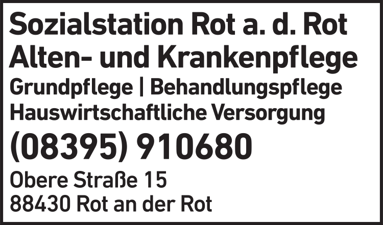Die Adresse von Sozialstation Rot an der Rot Alten + Krankenpflege lautet: Obere Str. 15, 88430 Rot an der Rot