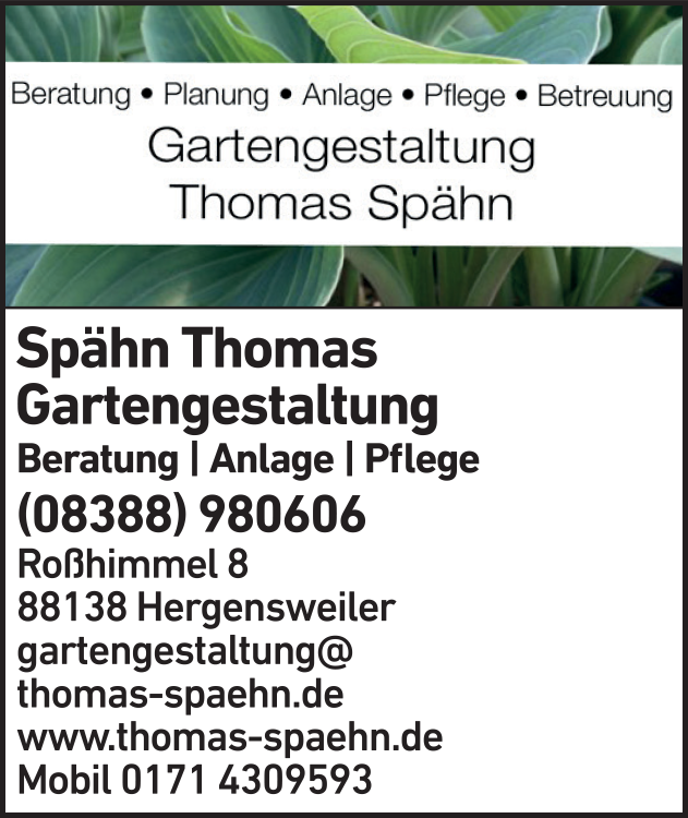 Die Adresse von Spähn Thomas Gartengestaltung lautet: Roßhimmel 8, 88138 Hergensweiler