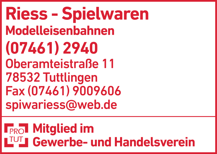 Die Adresse von Spielwaren Riess lautet: Oberamteistr. 11, 78532 Tuttlingen