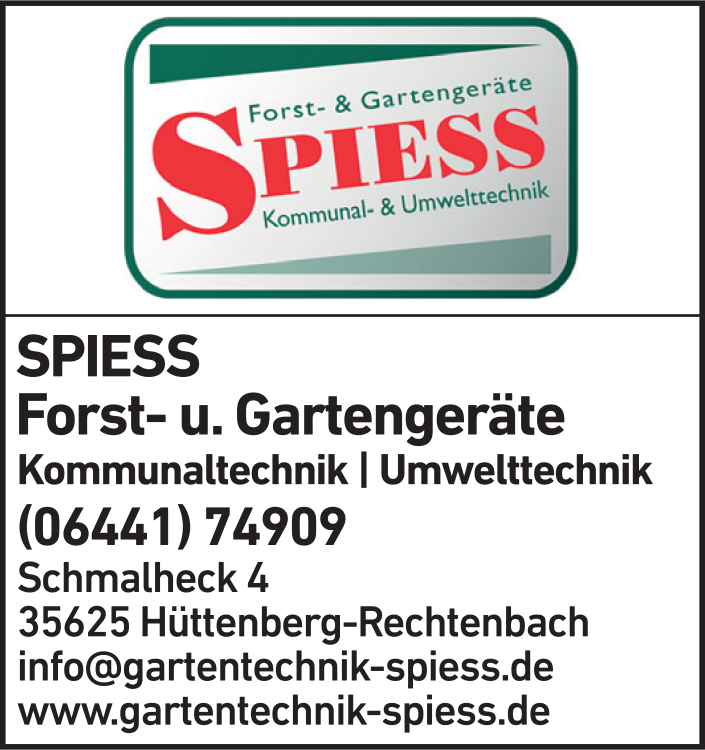 Die Adresse von Spiess Forst- u. Gartengeräte Kommunaltechnik lautet: Schmalheck 4, 35625 Hüttenberg