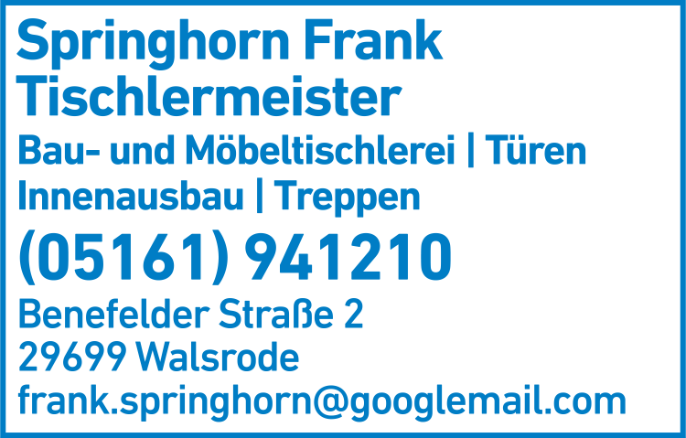 Die Adresse von Springhorn Frank Tischlerei lautet: Benefelder Str. 2, 29699 Walsrode