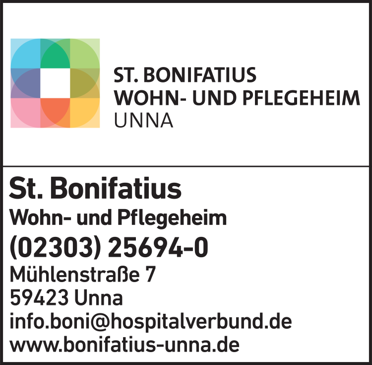 Die Adresse von St. Bonifatius Wohn- und Pflegeheim lautet: Mühlenstr. 7, 59423 Unna