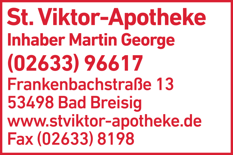 Die Adresse von St. Viktor-Apotheke lautet: Frankenbachstr. 13, 53498 Bad Breisig