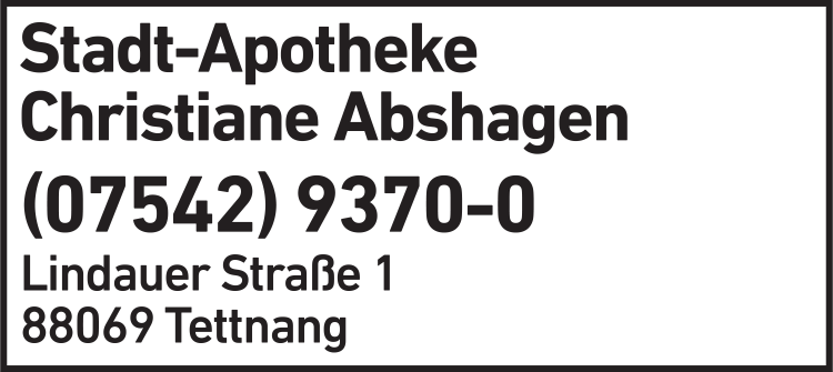 Die Adresse von Stadt Apotheke Christiane Abshagen lautet: Lindauer Str. 1, 88069 Tettnang