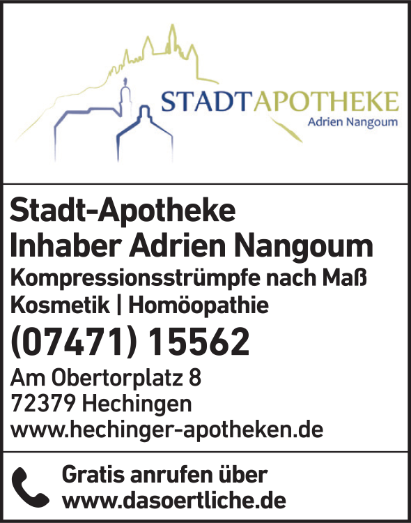Die Adresse von Stadt-Apotheke Inh. Adrien Nangoum lautet: Am Obertorplatz 8, 72379 Hechingen