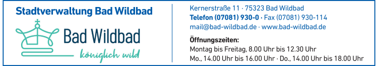 Stadt Bad Wildbad hat montags von 08:00 - 12:30 Uhr und 14:00 - 16:00 Uhr, dienstags bis mittwochs von 08:00 - 12:30 Uhr, donnerstags von 08:00 - 12:30 Uhr und 14:00 - 18:00 Uhr und freitags von 08:00 - 12:30 Uhr geöffnet.