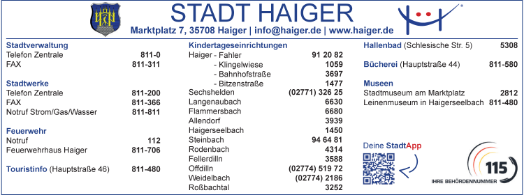 Die Adresse von Stadt Haiger lautet: Marktplatz 7, 35708 Haiger