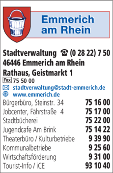 Stadtverwaltung Emmerich am Rhein Rathaus hat montags bis mittwochs von 08:30 - 12:00 Uhr, donnerstags von 14:00 - 18:00 Uhr und freitags von 08:30 - 12:00 Uhr geöffnet.