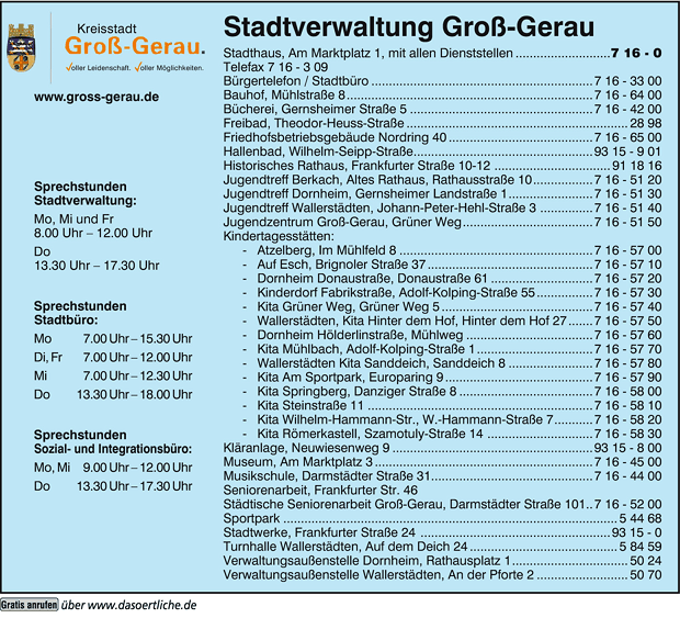 Stadtverwaltung Groß-Gerau bietet Kinderbetreuung, Jugendpflege, Schwimmbad, Kindertagesstätten, Bürgertelefon, Behördenauskunft und Stadtauskunft an.