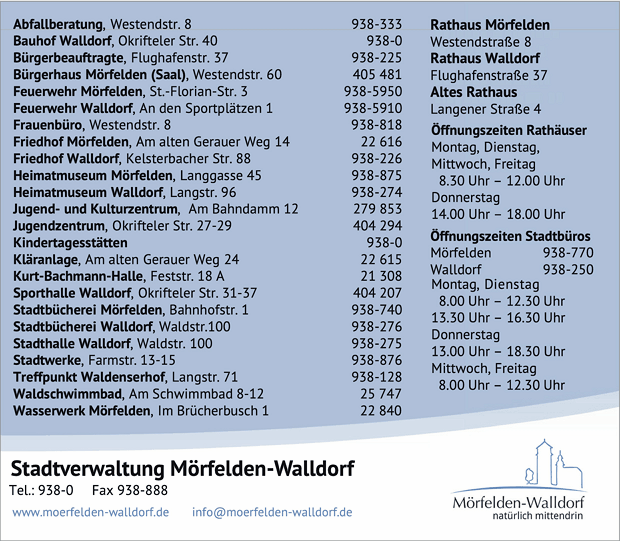 Die Adresse von Stadtverwaltung lautet: Westendstr. 8, 64546 Mörfelden-Walldorf
