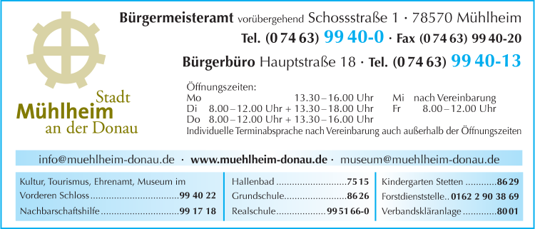 Die Adresse von Stadtverwaltung Mühlheim lautet: Schloßstr. 1, 78570 Mühlheim