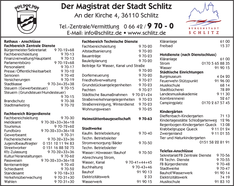 Die Adresse von Stadtverwaltung Schlitz lautet: An der Kirche 4, 36110 Schlitz