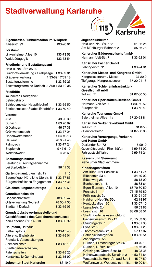 Die Adresse von Stadtverwaltung Seite 2 (E-K) lautet: Karl-Friedrich-Str. 10, 76133 Karlsruhe