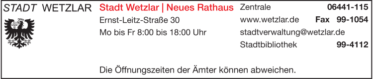 Wie sind die Öffnungszeiten von Stadtverwaltung Wetzlar?