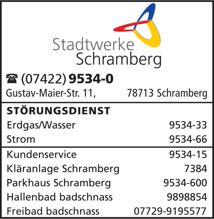 Die Adresse von Stadtwerke Schramberg Störungsdienst Erdgas/Wasser lautet: 78713 Schramberg