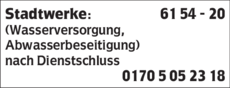 Stadtwerke hat montags von 08:00 - 12:00 Uhr und 13:30 - 17:00 Uhr, dienstags von 08:00 - 13:00 Uhr, mittwochs von 08:00 - 12:00 Uhr und 13:30 - 17:00 Uhr und donnerstags bis freitags von 08:00 - 12:00 Uhr geöffnet.