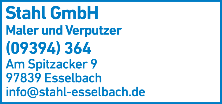 Die Adresse von Stahl GmbH Maler und Verputzer lautet: Am Spitzacker 9, 97839 Esselbach