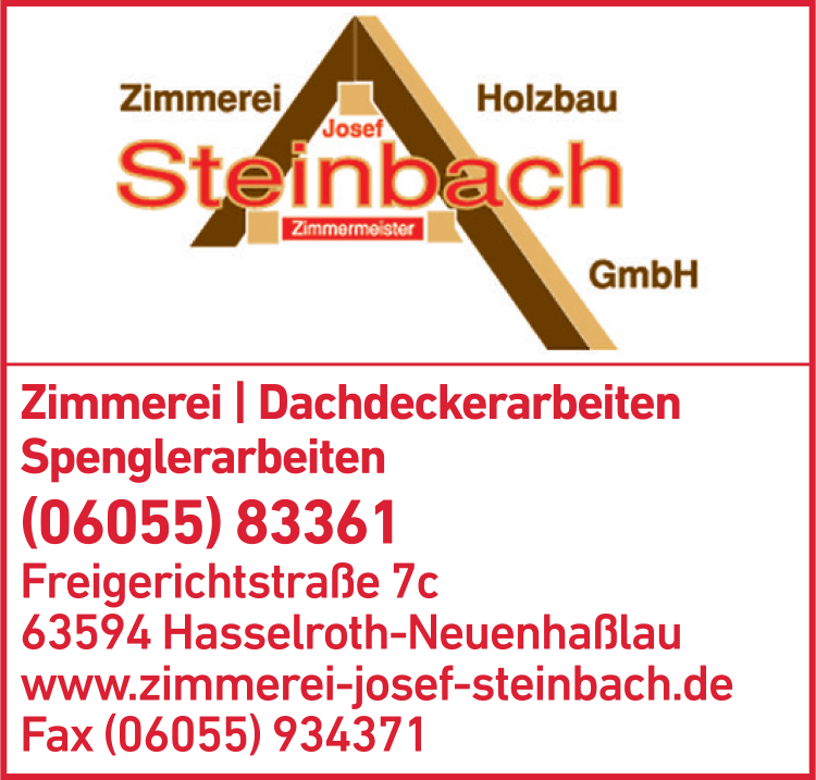 Die Adresse von Steinbach Josef Zimmerei lautet: Freigerichtstr. 7 c, 63594 Hasselroth