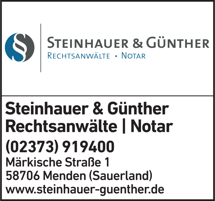 Die Adresse von Steinhauer & Günther Rechtsanwälte, Notar lautet: Märkische Str. 1, 58708 Menden