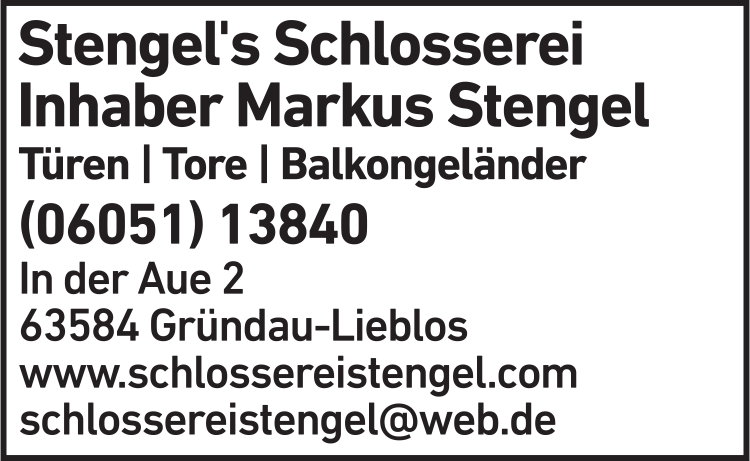 Die Adresse von Stengel's Schlosserei lautet: In der Aue 2, 63584 Gründau-Lieblos