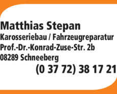 Die Adresse von Stepan Matthias Karosseriebau lautet: Prof.-Dr.-Konrad-Zuse-Str. 2 b, 08289 Schneeberg