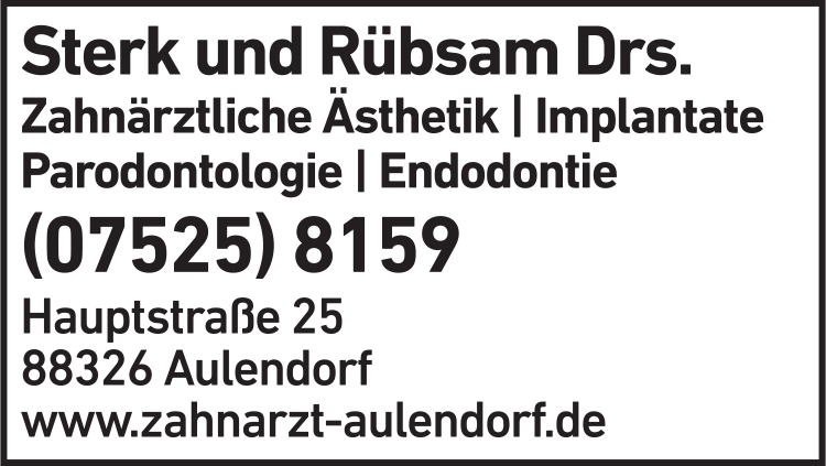 Die Adresse von Sterk u. Rübsam Zahnarztpraxis lautet: Hauptstr. 25, 88326 Aulendorf