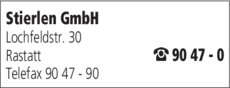 Die Adresse von Stierlen GmbH lautet: Lochfeldstr. 30, 76437 Rastatt