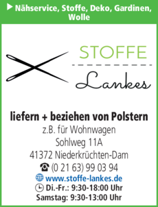 Die Adresse von Stoffe Deko & Textilhandel Lankes lautet: Sohlweg 11 A, 41372 Niederkrüchten