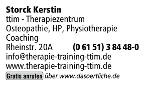 Die Adresse von Storck Kerstin ttim - Therapiezentrum Osteopathie, HP, Physiotherapie lautet: Rheinstr. 20 A, 64367 Mühltal
