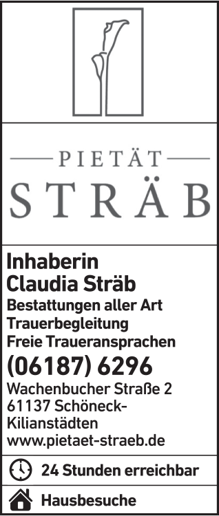 Die Adresse von Sträb Pietät Inh. Claudia Sträb lautet: Wachenbucher Str. 2, 61137 Schöneck