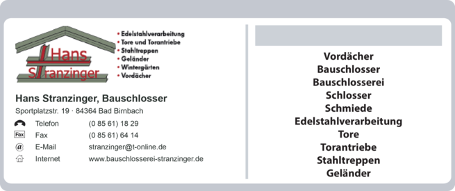 Die Adresse von Stranzinger Hans lautet: Sportplatzstr. 19, 84364 Bad Birnbach