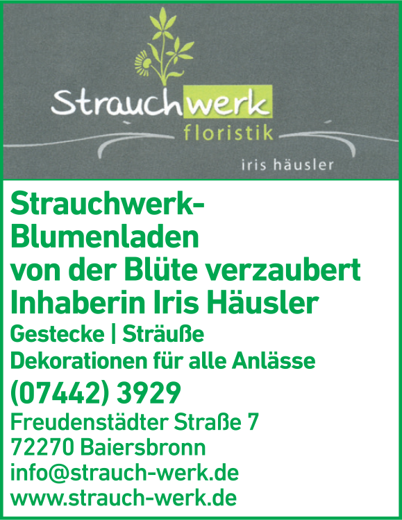 Die Adresse von Strauchwerk-Blumenladen lautet: Freudenstädter Str. 7, 72270 Baiersbronn