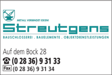 Die Adresse von Streutgens Schlossereibetriebe GmbH & Co. KG lautet: Auf dem Bock 28, 47669 Wachtendonk