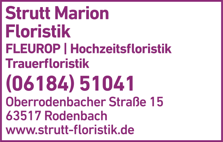 Die Adresse von Strutt Marion Floristik, Blumen und Pflanzen lautet: Oberrodenbacher Str. 15, 63517 Rodenbach