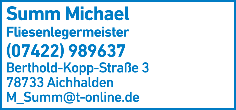Die Adresse von Summ Michael Fliesenlegermeister lautet: Berthold-Kopp-Str. 3, 78733 Aichhalden