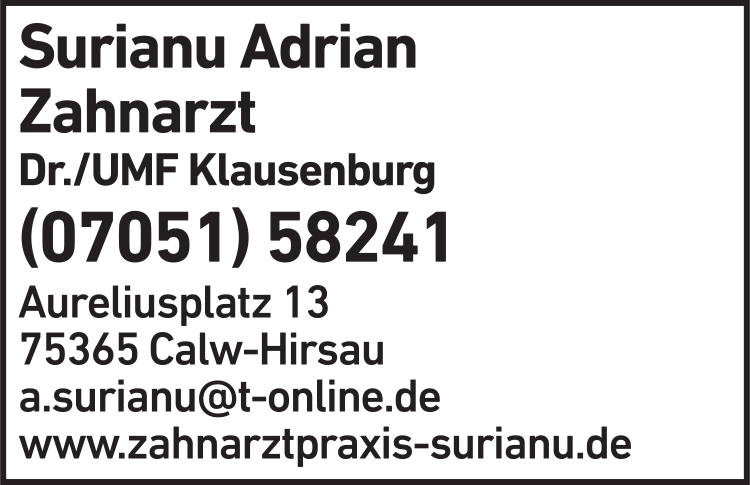 Die Adresse von Surianu Adrian Dr. Zahnarzt UMF Klausenburg lautet: Aureliusplatz 13, 75365 Calw