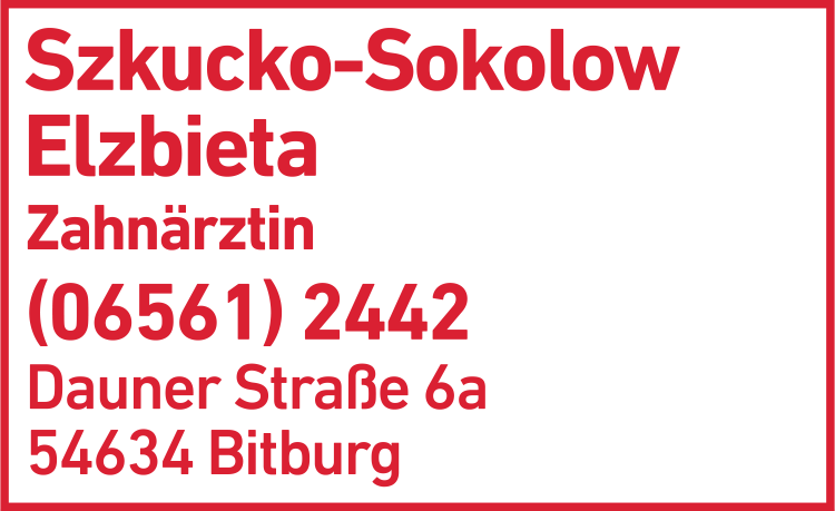 Die Adresse von Szkucko-Sokolow Elzbieta Ärztin für Zahnmedizin lautet: Dauner Str. 6 A, 54634 Bitburg